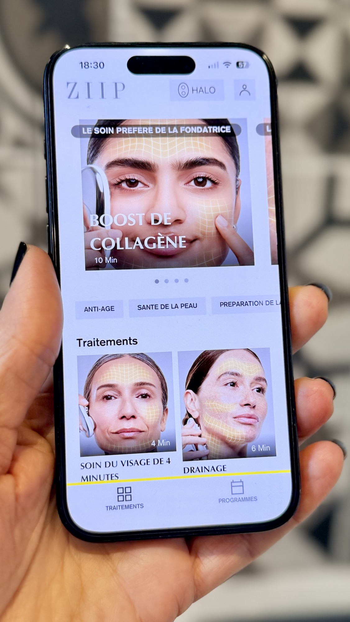 L’un des aspects que j’apprécie particulièrement avec cet appareil, c’est son application mobile, une aide précieuse pour utiliser correctement l’appareil Halo 2.0. Il suffit de la télécharger (ZIIP BEAUTY) en quelques secondes pour accéder aux différents protocoles guidés.