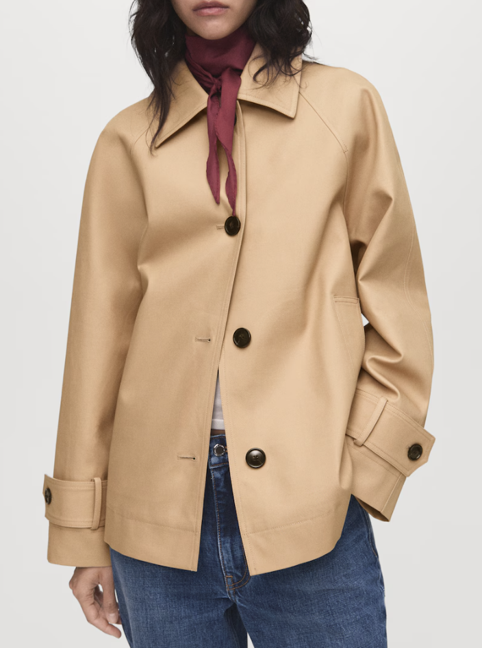 Chez Mango, le blazer vert pistache en lin mélangé, le trench court beige.