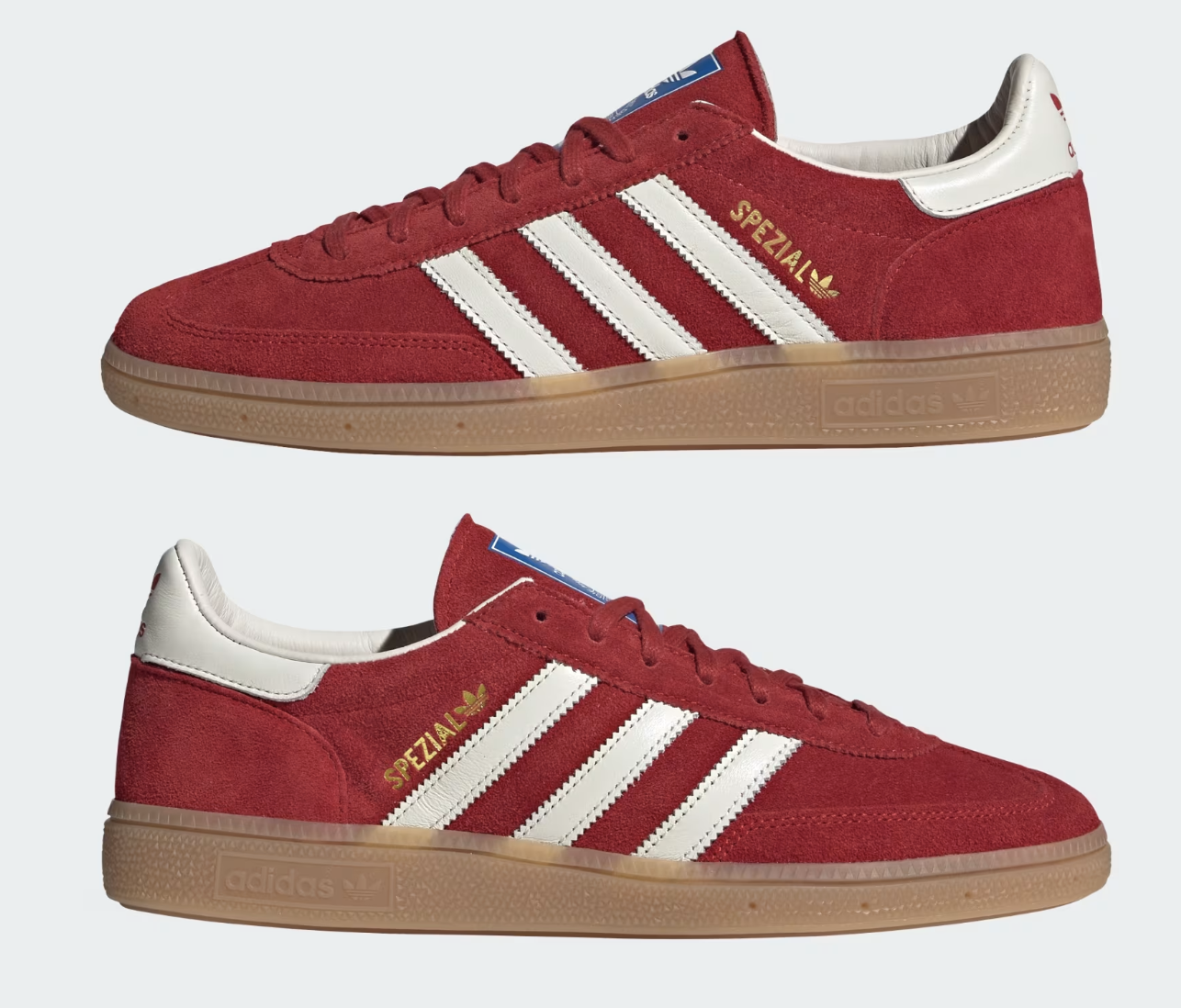 – Chez Adidas, le modèle Handball Spezial rouge Made in Germany,