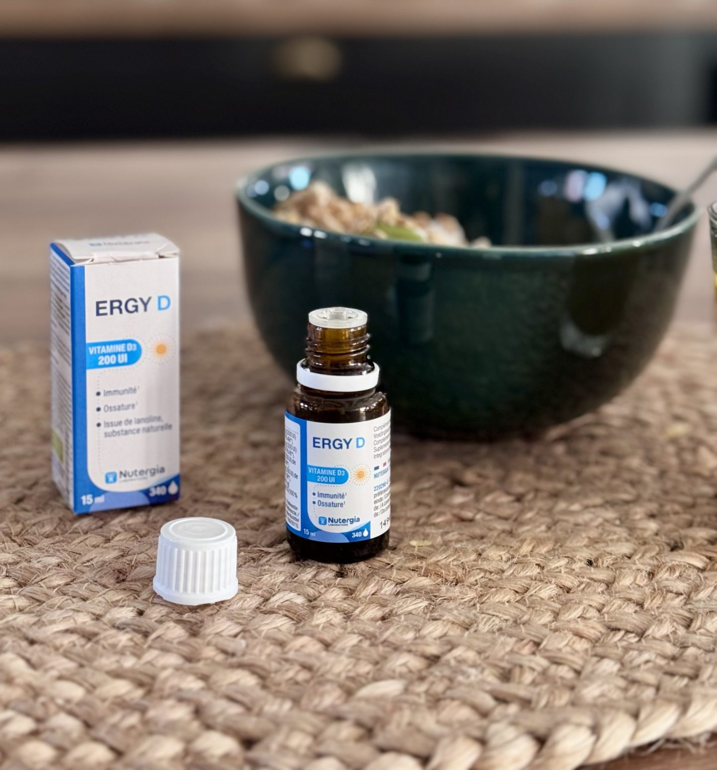 Sur les conseils de ma pharmacienne, j’ai opté pour un flacon de vitamine D3 (considérée comme la plus efficace) de la marque Ergy D. J’en prends 5 gouttes par jour sur un corps gras comme un yaourt.