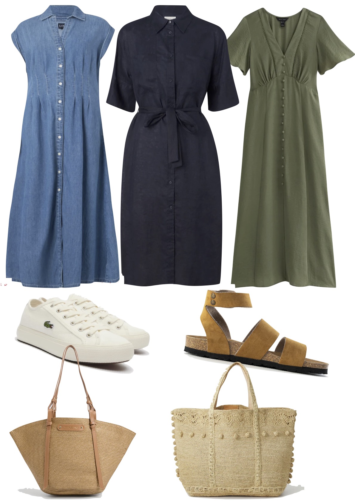 Aux pieds, des sandales plates ou compensées, des mocassins élégants ou des baskets fines blanches fonctionnent très bien selon l’occasion. Ajoutez un sac seau ou une besace pour moderniser l’ensemble, et vous obtenez une tenue impeccable pour le bureau, un déjeuner ou même une soirée légère d’été.