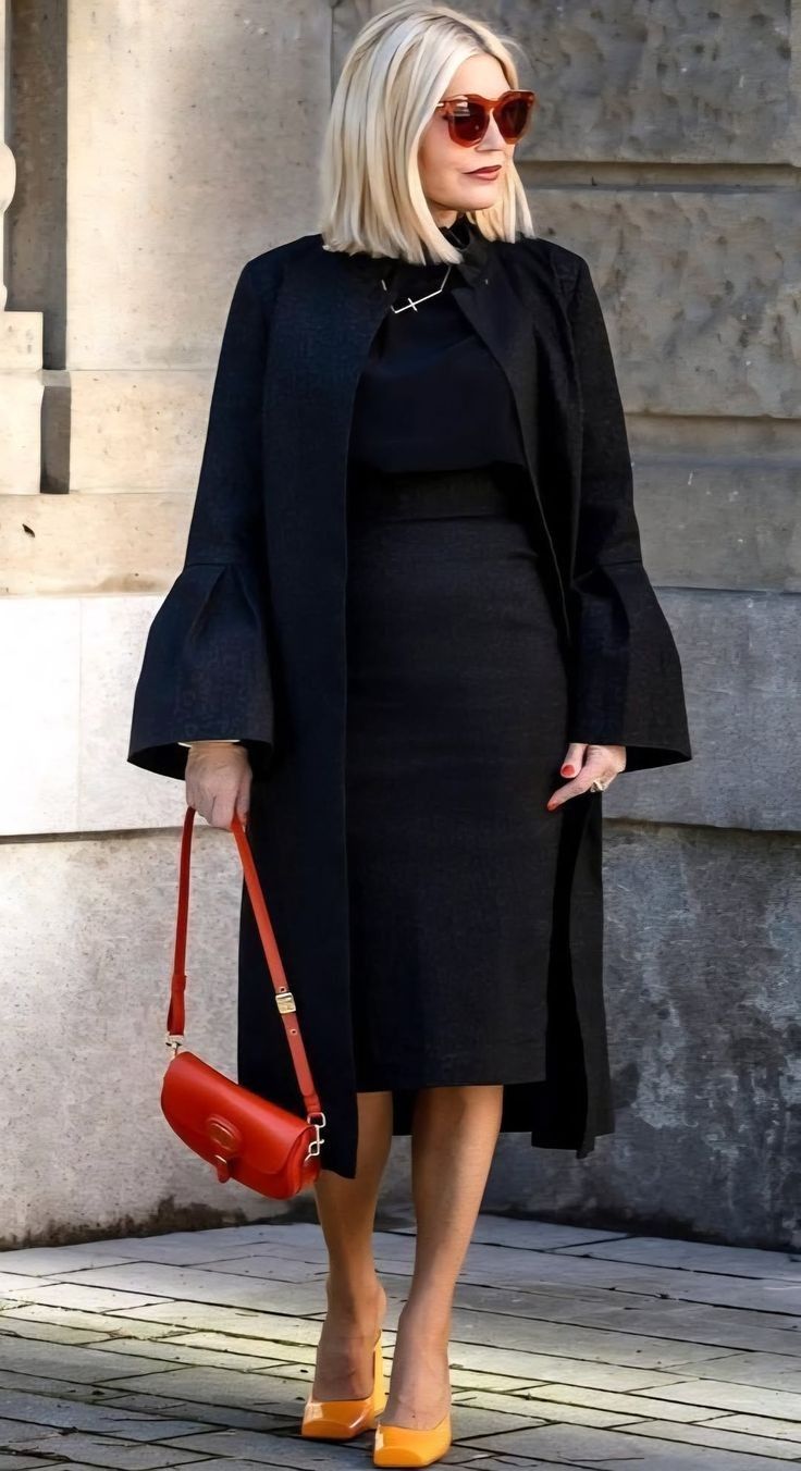 Pour les chaussures, on peut opter pour des escarpins ou des sandales à petits ou hauts talons selon l’événement et la saison. Un blazer structuré, un manteau droit en laine ou un manteau en fausse fourrure complètent parfaitement la tenue et apporte une touche de raffinement supplémentaire.