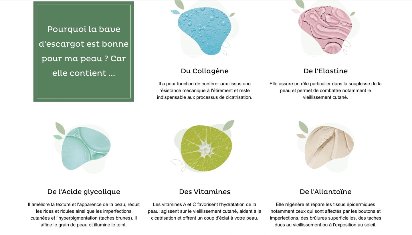 La bave d’escargot est naturellement riche en allantoïne, collagène, élastine, acide glycolique, vitamines et antibiotiques naturels, un cocktail particulièrement intéressant pour les peaux matures. En effet, il permet à la fois de réparer, hydrater, lisser et améliorer la qualité globale de la peau.