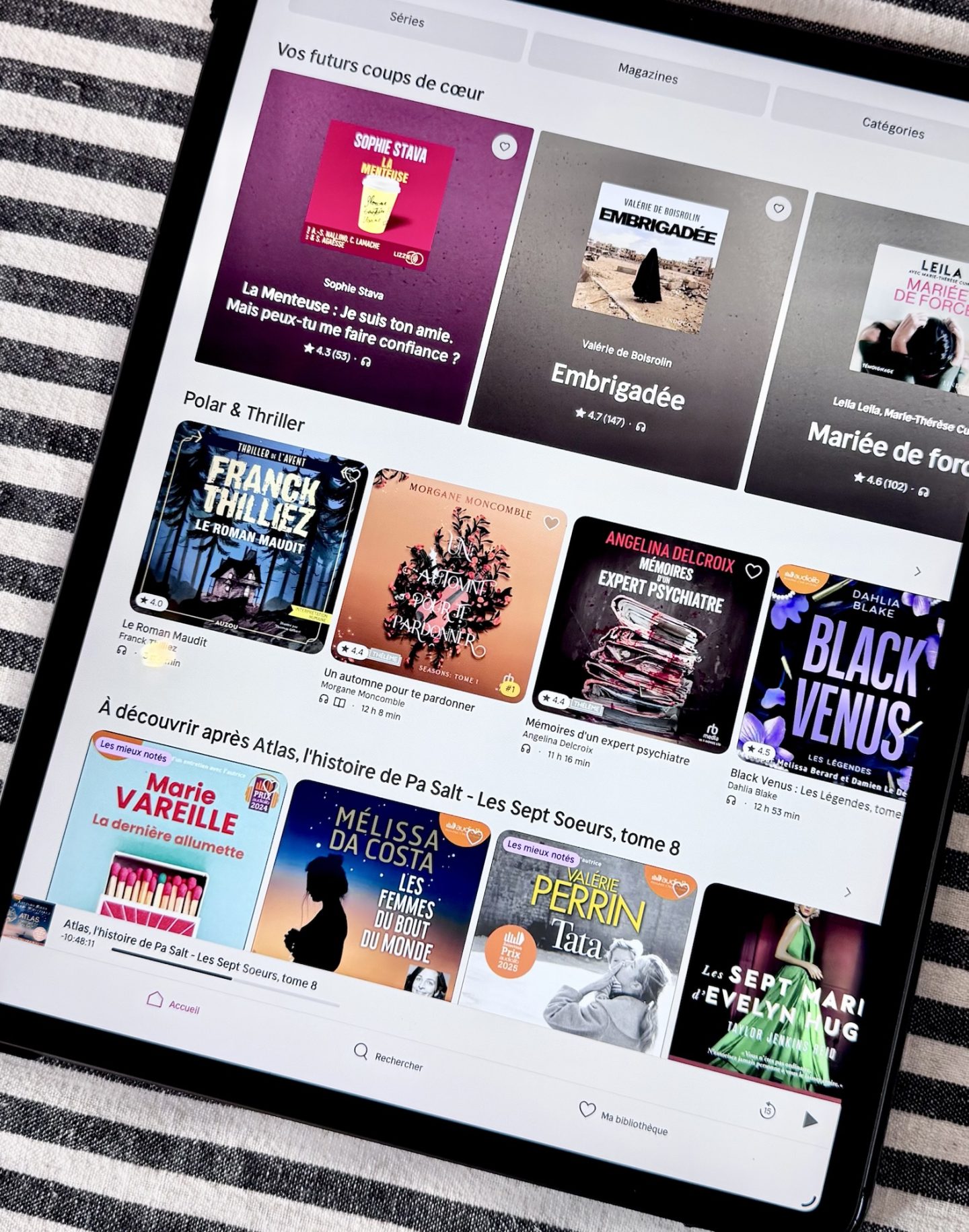 Si vous ne connaissez pas encore Nextory, il s’agit d’une plateforme de lecture illimitée qui donne accès à des milliers de livres en audio comme en numérique. Ce service m’a permis de renouer avec la lecture de manière fluide et moderne : on peut lire ou écouter où l’on veut, quand on veut et alterner entre formats selon son rythme et ses disponibilités. D’ailleurs, j’ai pris pour habitude d’écouter des livres dans les transports en commun et également lorsque que je repasse transformant ainsi une corvée du quotidien en un moment de plaisir et d’évasion.